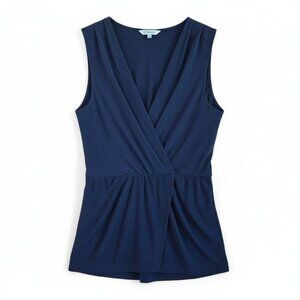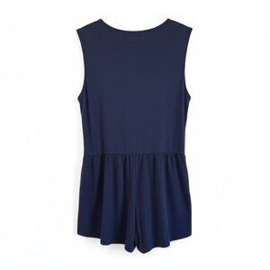 navy romper, sleeveless romper, wrap front romper, elastic waist romper, summer outfit, casual romper, polyester romper, lightweight jumpsuit, women's romper, BCBG romper, sleeveless jumpsuit, surplice wrap, skorts romper