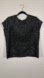 Black sequins and beads. Beads are in a floral design and trip around the neckline and armpits.