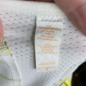 This is a cute yellow, black, blue and purple top that is easy to match with solid shorts. There is a mesh insert at the front neck and on the back.