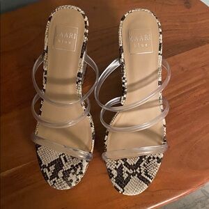 Step out in style with these chic snake print heels. Featuring a striking black and cream design, these shoes are perfect for any occasion.. Man made upper and soles. Not real snake skin. Ladies size 8. Never worn.