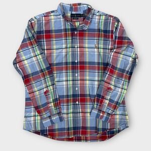 A classic Ralph Lauren men's long-sleeve button-down shirt in a vibrant plaid pattern. This Oxford shirt features a Slim Fit design and is crafted with stretch fabric for comfort and ease of movement. The iconic Polo player logo is embroidered on the chest. Perfect for casual outings, business casual settings, or layering.