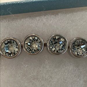 Elegant silver bracelet with sparkling crystals. Perfect for any occasion. Last four pictures are side by side with a blue ice bracelet and clear bracelet to see the color better. I have listed the blue ice bracelet and clear bracelet separately. This listing is only for the lighter bracelet not the blue or clear one.