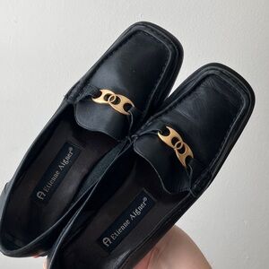 Vintage Etienne Aigner Otto Loafers in Black. Genuine leather upper with gold bit hardware, and slight stack heel. All day, comfortable wear, priced to reflect slight white scuffing to back bottom heel-- difficult to notice. Otherwise, nice pre-owned condition with lots of life left.