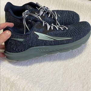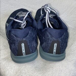 Dark blue athletic shoes with light blue accents. Ideal for running and sports.