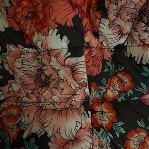 Beautiful coral-red alpine jacket with a flattering tailored fit, cozy insulation, soft black & floral fleece-lined interior, and faux-fur trimmed hood for warmth and style.