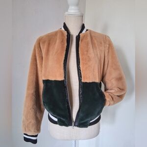 Stay stylish and warm with this two-tone faux fur bomber jacket. Featuring a chic tan and black design, this jacket is perfect for any occasion.