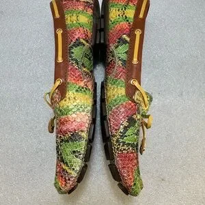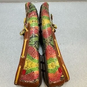 These are Marc Joseph designed in NYC and handcrafted by skilled artisans in Brazil. Gel heel insert, fully padded footbed for optimized comfort. They feature a multicolor snakeskin-embossed leather upper in shades of green, red, yellow, and black arranged in a geometric pattern. The shoes have a classic moc-toe loafer silhouette with visible hand-style stitching around the toe. The signature yellow studded leather bow tie detail sits across the vamp, adding a polished yet playful touch. The interior is lined in soft metallic gold leather. The trim around the opening is a smooth brown leather, giving contrast and structure. Overall, they’re a statement loafer—preppy meets eclectic—ideal for adding color and texture to an outfit while remaining comfortable and refined. In great condition. Size 9