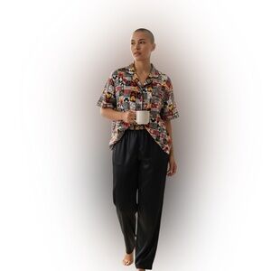 Stylish black pants pijama set paired with a colorful Mickey print shirt. Perfect for casual wear.