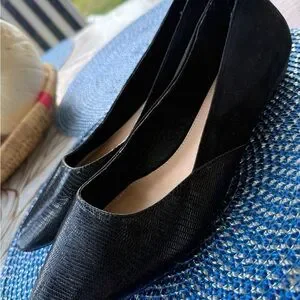 Chic black flats with a textured finish. Ideal for versatile styling. Comfortable and stylish.