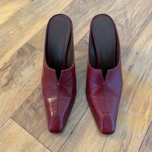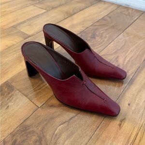 Donald J. Pliner red leather heeled mules with beautiful front stitching and split detail. Size 6, in excellent condition!