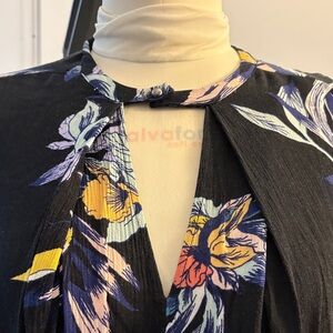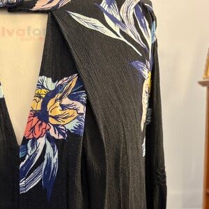 Elegant black blouse with vibrant floral design. Long sleeves and flowy silhouette. Perfect for casual wear.