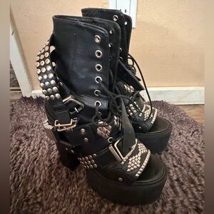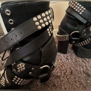 Jeffrey Campbell Mestizo Platform Leather Strap Boots. Heavy black tall platform heeled booties. Lace up front with open toe. Straps allover with some adjustable and all having a different design with silver grommets. These shoes are totally rad, but are heavy and super tall! Worn a few times, good condition. Size 8.5.