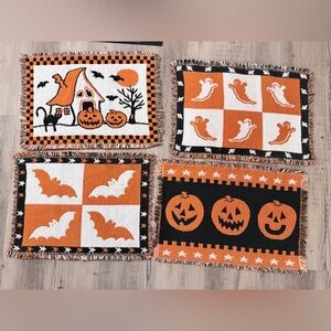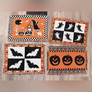 Set of four Halloween themed woven rugs. Features ghost, pumpkin, witch, and bat designs. Vibrant orange, black, and white colors.
