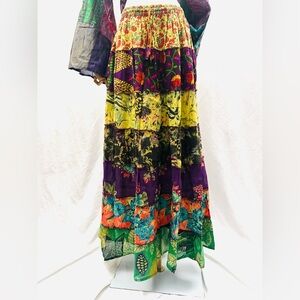 Embrace vibrant style with this floral patchwork maxi skirt. Featuring a mix of purple, yellow, and green hues, this skirt adds a colorful touch to any wardrobe.