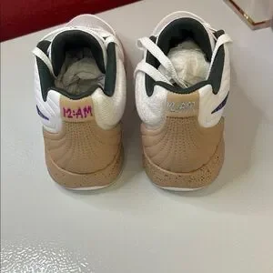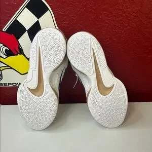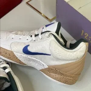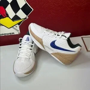 Sleek Nike sneakers in white with a striking blue swoosh. Tan accents add a stylish touch. Box messed up.