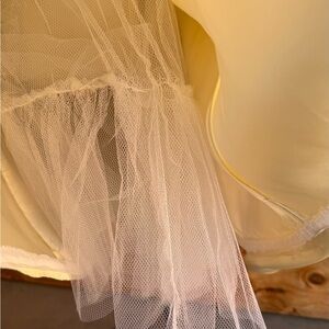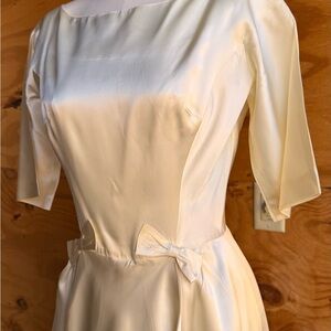 Stunning authentic mid-century wedding dress by Lorrie Deb, dating to the late 1950s–early 1960s. Crafted in a soft ivory/buttercream satin, this gown features a beautifully clean, minimalist silhouette with a gently fitted bodice, elbow-length sleeves, and delicate bow accents at the waist for subtle feminine detail.