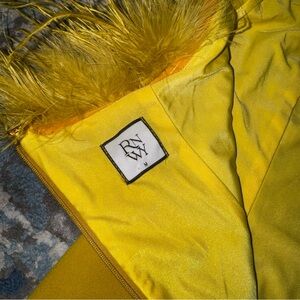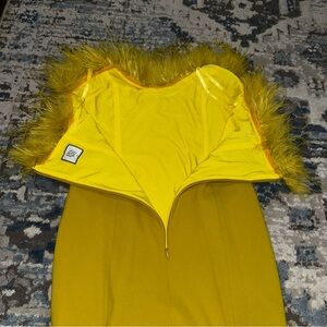 Turn heads with this stunning yellow strapless dress, featuring elegant feather detailing. Perfect for any special occasion.