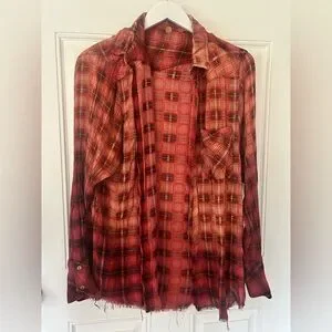 Casual plaid shirt with frayed hem. Features a single chest pocket and button cuffs. Ideal for everyday style.