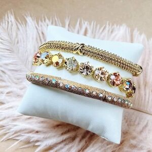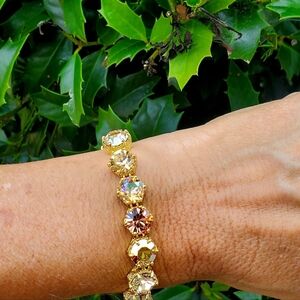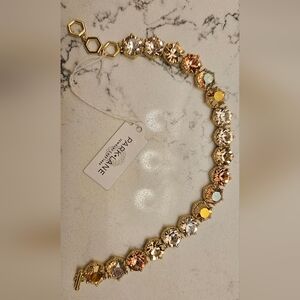 Park Lane Peaches and Cream Limired-efition Bracelet. This beautiful sparkling tennis bracelet gives off hues of iridescent peachy and nude tones. The hexagonal cut 3 carat crystals are finished off in a soft golden metal. 7” to 8” with a Hexagonal Extender.