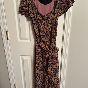 Elegant floral midi dress. Features pink, yellow, and black hues. Perfect for any occasion. I’m including the slip dress this neckline was a bit low for me - so you get a BOGO