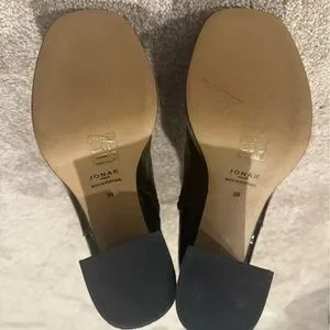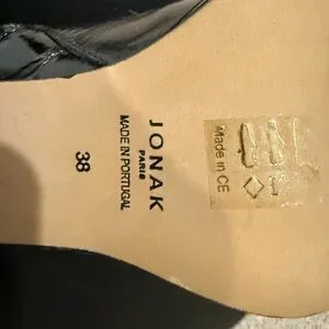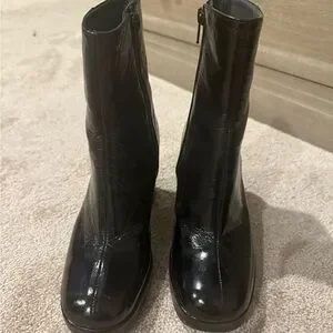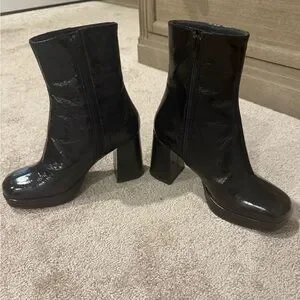 Elegant black patent leather platform boots with a sleek design. Perfect for any occasion. Heel is 3 inches with platform. Block heel. Excellent condition. Only worn one time. Made in Paris.