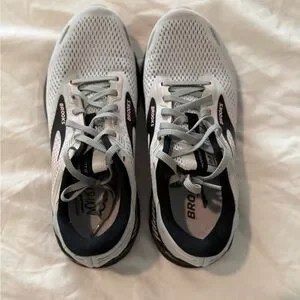 Brooks athletic shoes in gray with black accents. Perfect for sports and casual wear. Will ship in box.