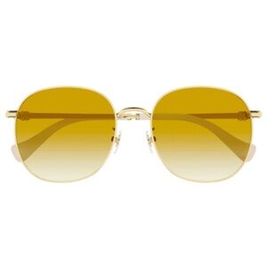 Stylish Gucci sunglasses with a sleek gold frame. Amber lenses offer a modern look.
