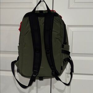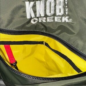 Stylish olive backpack with bold red accents and Knob Creek branding. Features durable material and practical design. Ideal for daily adventures. Computer sleeve in main zipped compartment. Two pockets in front zipped compartment. Pockets on both sides of exterior.