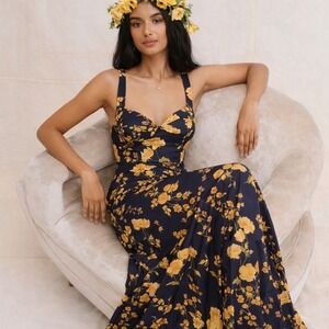 Brand new with tags Reformation Lecce Dress in the coveted Bernadette colorway. This elegant navy maxi features a romantic yellow floral print, a flattering fitted bustier-style bodice, wide straps, and a graceful floor-length silhouette. Finished with a low scoop back and button detailing for a timeless, feminine look.