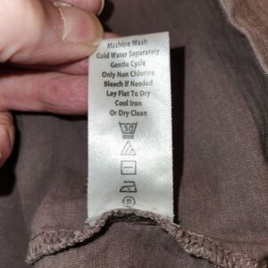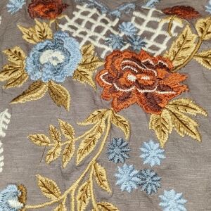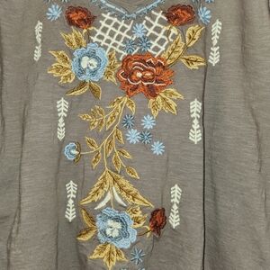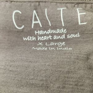 Caite Handmade in India Taupe/Mauve Embroidered Bell Sleeve Top Size XL has stretch and is a perfect Boho style. The embroidery is all in the front and the combination of colors on the taupe is gorgeous! Pinks, Rust, Light Blue, Cream and Tan. Cute bell sleeve with a ruffle and slight V-Neck. Neutral enough to make it easy for styling with Jeans, Pants or Skirt. (The color of this top is somewhere between Taupe & Mauve)