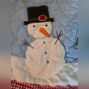 Beautiful vintage Pottery Barn Kids quilted Christmas tree skirt (2006) featuring charming holiday appliqué designs including Santa, reindeer, snowman, and decorated Christmas trees. Soft quilted cotton with a red gingham border — perfect for cozy farmhouse, traditional, or classic Christmas décor.