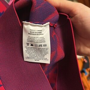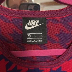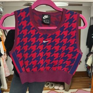 Nike houndstooths nylon “sweater” style crop top. Embroidered white swoosh. 97% nylon, 3% spandex. Size M, crop top fits on the smaller/tighter end.