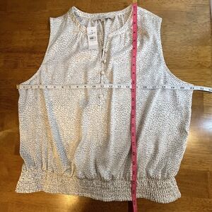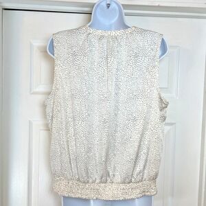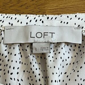 For sale is this women's Loft sleeveless gathered bubble hem shell, size large. Off-white with black dots, satin finish. Tab collar. Front Henley placket. Sleeveless. The bubble hem freshes up this smart and fluid Henley shell, creating a flattering staple for every silhouette.