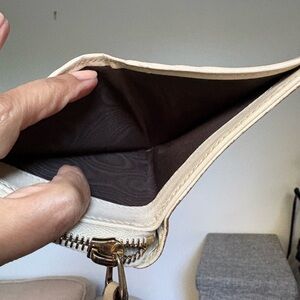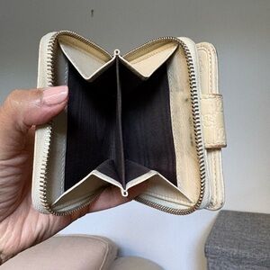 Chic Gucci compact wallet in cream leather. Features signature embossed pattern.
