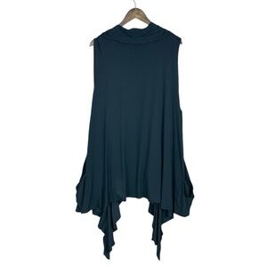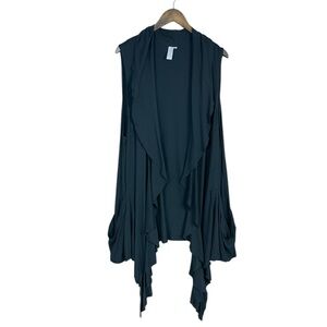 Flutter & Squeak butter soft cardigan. Open Front Ruffle cascading waterfall front neckline. Flowy Sleeveless cardigan vest. Draped Side pockets.