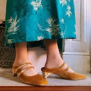 Sam Edelman McKenna mary jane style mule heel in Bronze velvet, a rich golden brown.