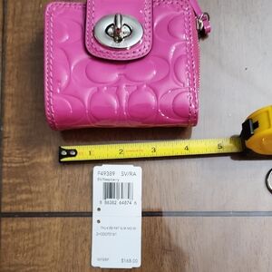 Coach Stylish pink patent leather wallet. Features signature Coach design. Secure clasp closure.