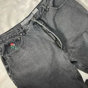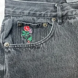 Channel your inner flower child with these vintage Bugle Boy jeans featuring stunning red rose embroidery on the front pocket and lower leg. These black, high-rise jeans have a slim tapered fit and are perfect for adding a touch of romance to your retro wardrobe.