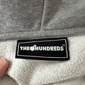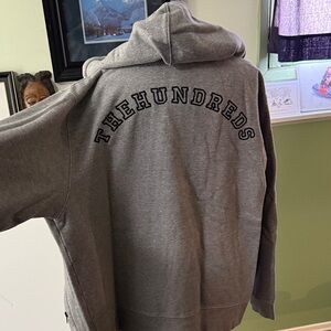 The Hundreds gray zip-up hoodie featuring an embroidered iconic exploding bomb logo. In amazing condition, heavy quality material. A warm hoodie for a cold day. Very cool styling.