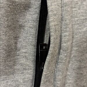 Chic gray hoodie with iconic striped sleeves. Features front zipper and pockets.