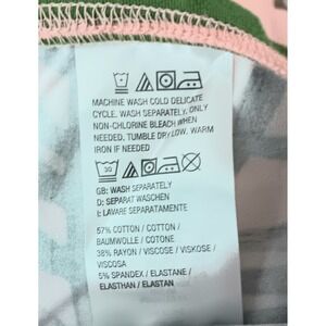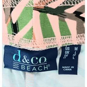 The product is a pair of Denim & Co beach pants in women's size M, featuring a palm print jersey fabric with a pull-on closure and pockets. These pants are suitable for occasions such as travel, parties, or casual wear, and are machine washable. The multicolor design with a wide-leg inseam of 33 inches and ankle length make them perfect for a summer vibe, with accents like a logo adding a touch of style. Made from a blend of spandex, rayon, and cotton, these pants offer a comfortable and trendy option for the beach or city outings.