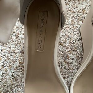 BCBG MaxAzria summer sandals. Cream color with silver buckles. Frosted clear strap at toe. Size 8.5 but fits a little snug.