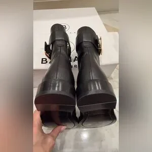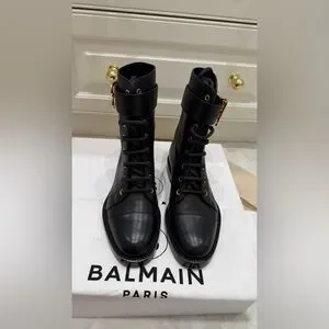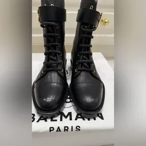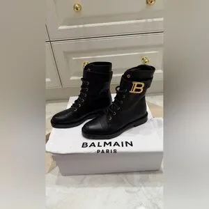 Balmain Black Leather Combat Boots with Gold B Symbol; Size 35; Brand New in Box