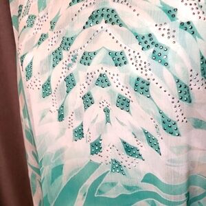 Heavier top underneath the flowy outer layer. Shoulder to shoulder 16", armpit to armpit 21 1/2", total length 29 1/2