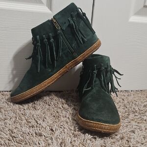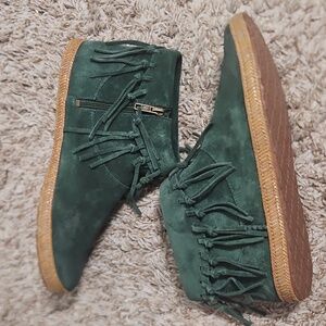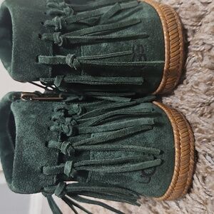 UGG Shenandoah, UGG moccasin boots, suede ankle booties, fringe booties, boho boots, western boho, zip ankle boots, moc toe, moccasin style, green suede boots, festival boots, fall boots, cozy boots, cabin style, rustic chic, outdoorsy, lodge, hippie boho, casual boots, winter shoes, ankle zip boots