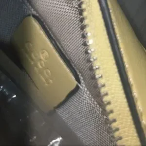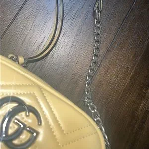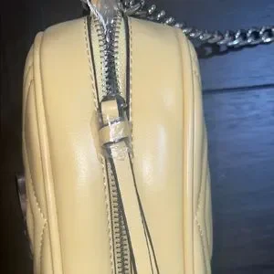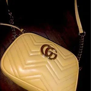 Elegant Gucci crossbody in light yellow. Features signature GG logo. Perfect for adding a pop of color.