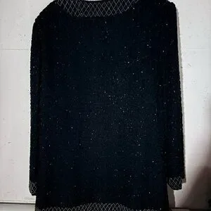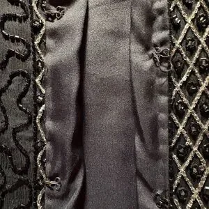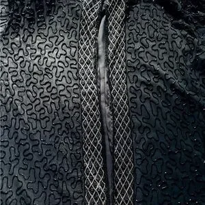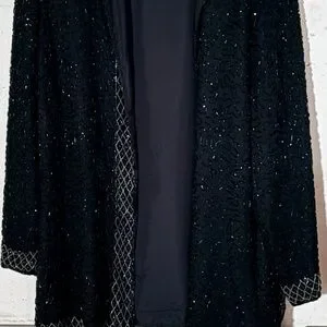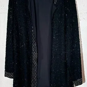 This elegant black beaded jacket is perfect for adding a touch of sophistication to any outfit. The intricate beadwork enhances its luxurious appeal.