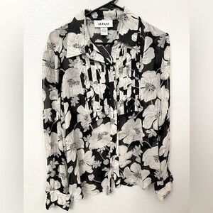 Alfani Floral Collared Button Down Silk Black and White Blouse Size 12