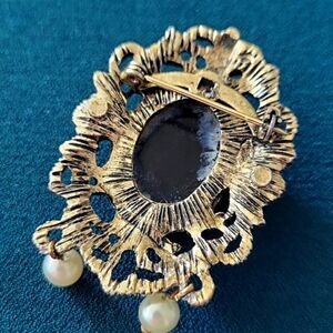 Materials: Gold-tone metal, glass molded cameo, faux dangling pearls