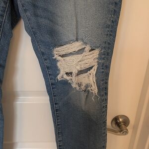 Trendy light blue jeans with a distressed look. Perfect for casual outings. Comfortable and stylish.